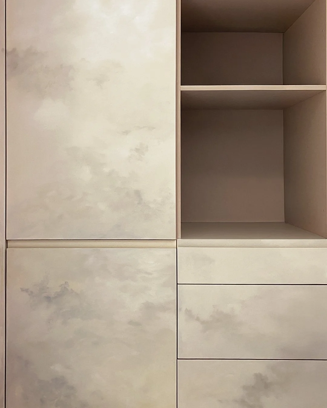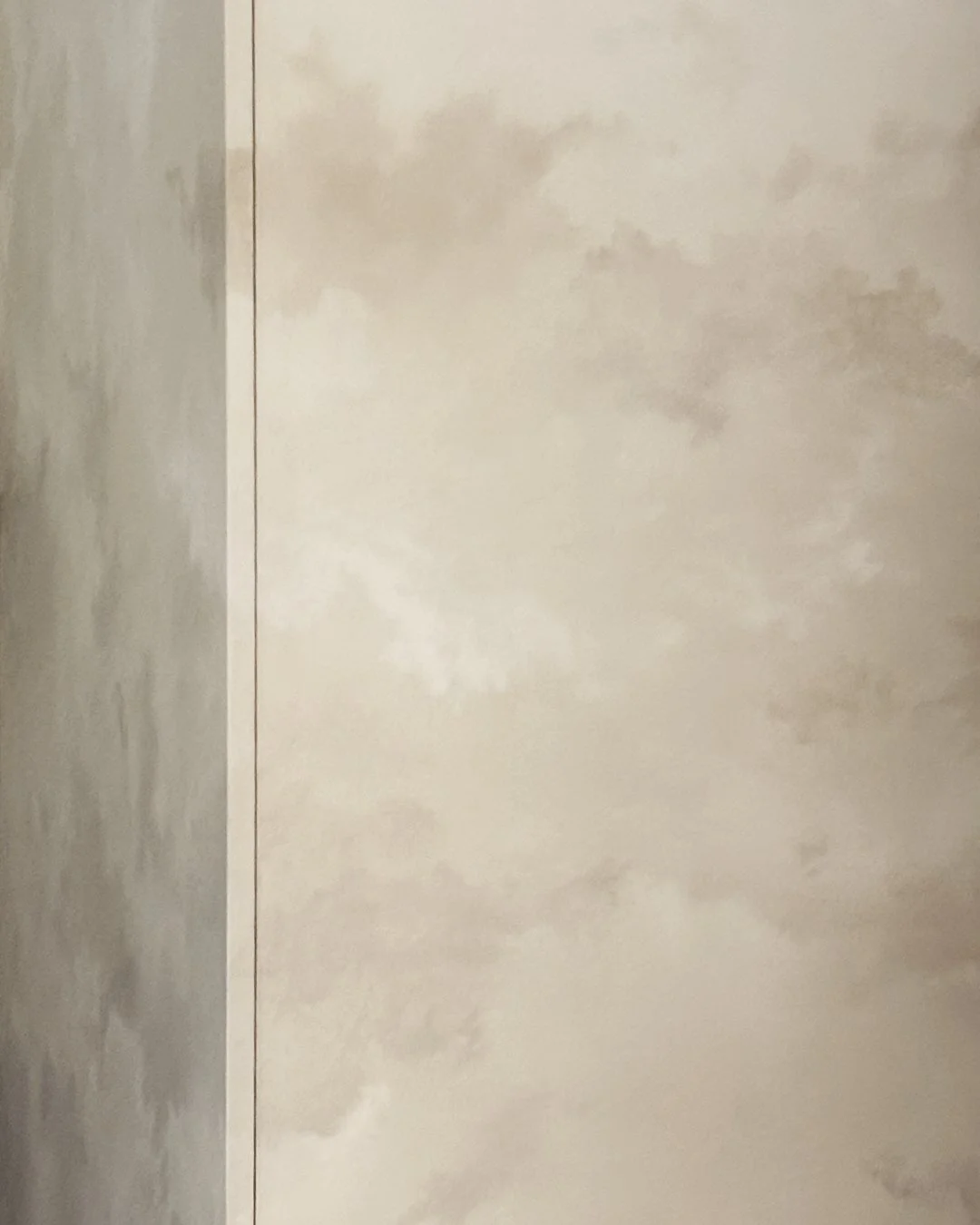L’idée centrale était de créer un espace aérien et lumineux, où la peinture viendrait sublimer l’ambiance tout en s’intégrant parfaitement aux matériaux nobles déjà présents. Pour cela, j’ai imaginé une fresque en dégradé, inspirée du ciel, qui enveloppe les meubles de la cuisine et accentue la sensation de hauteur et de profondeur.
