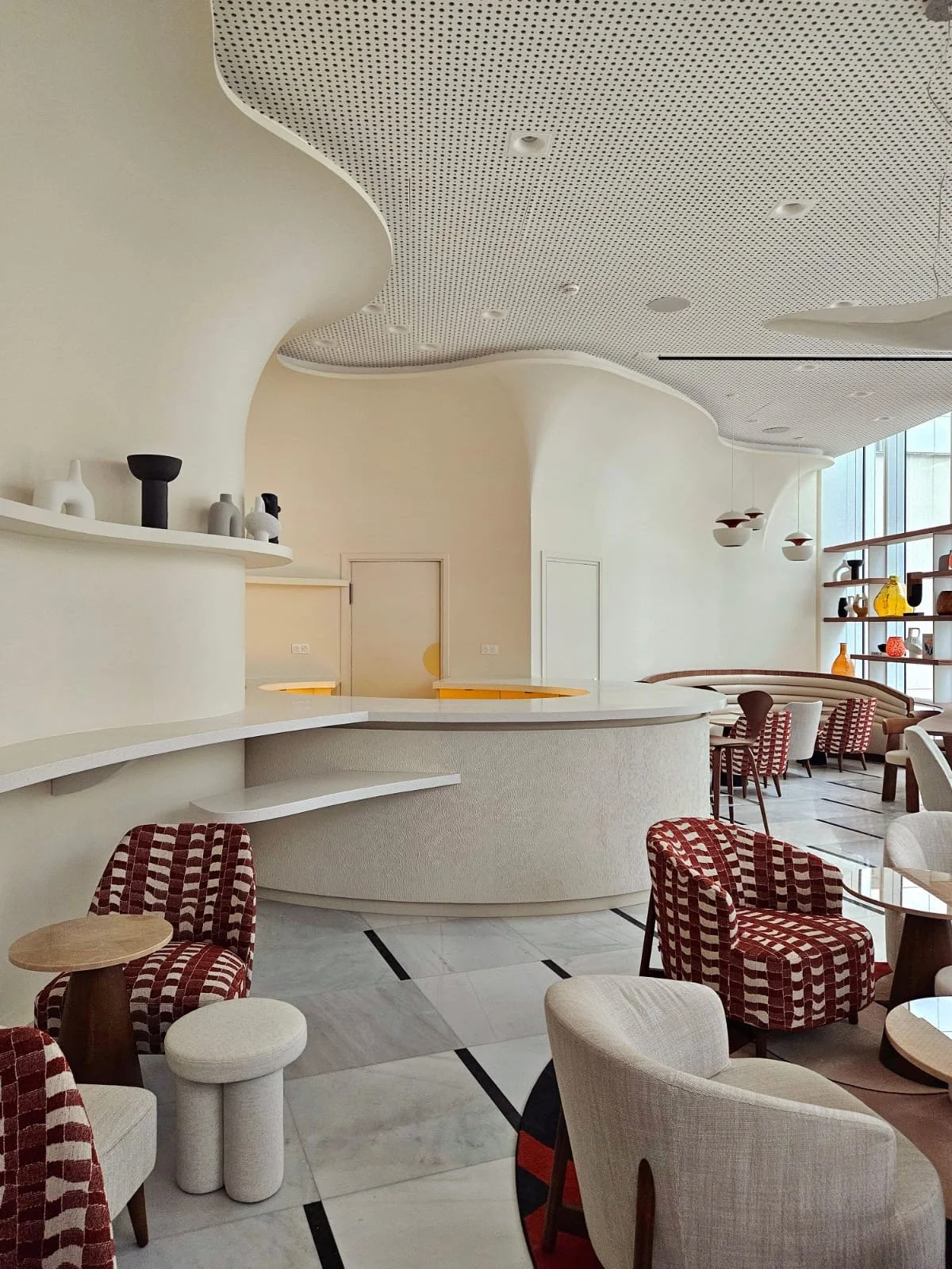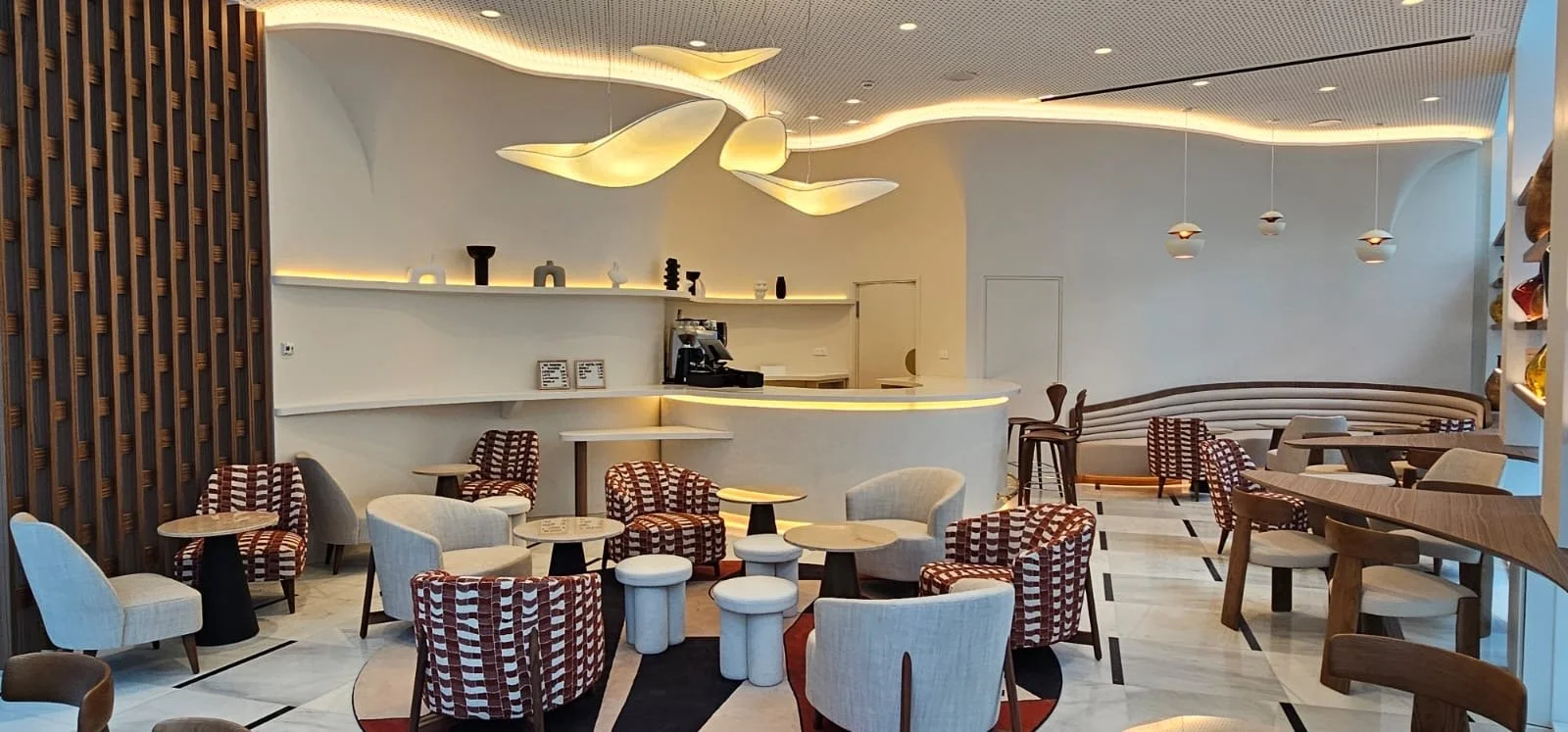 Le jeu de lumière sur cette surface sculptée met en valeur les courbes et reliefs, renforçant la sensation de mouvement et de matière vivante. Ce travail apporte une atmosphère apaisante, tactile et raffinée à l’espace, en parfaite cohérence avec l’identité du lieu.