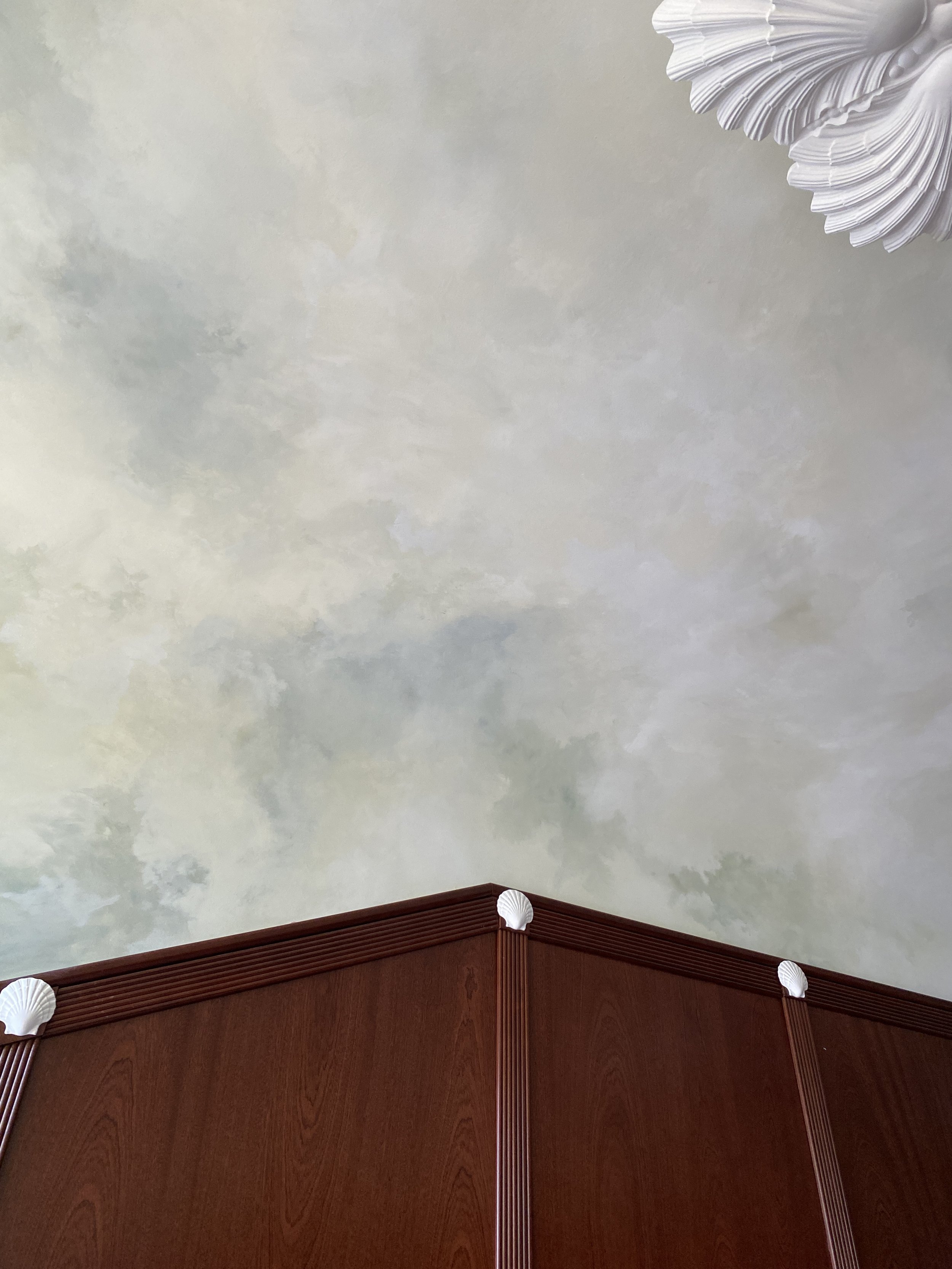 Création d’un décor de ciel vert à la peinture acrylique, pensé pour sublimer les boiseries en acajou. Des touches de jaune nacré et de blanc rehaussent les éléments en plâtre, apportant une harmonie délicate à cet écrin marin.